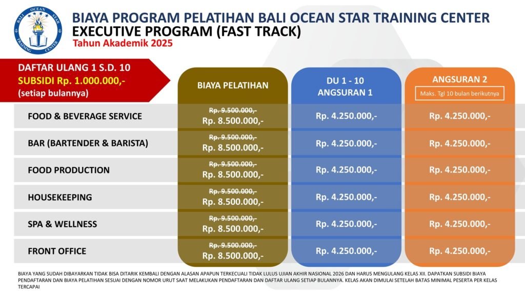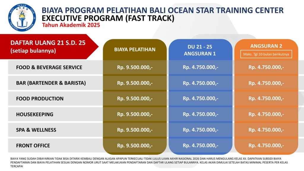 4 bulan pelatihan, 6 bulan on the job training, dilanjutkan internship/penyaluran kerja ke luar negeri – Merupakan program untuk peserta pemula yang belum memiliki pengalaman di bidang hospitality maupun mereka yang telah memiliki pengetahuan dasar atau pengalaman kerja di bidang pariwisata.