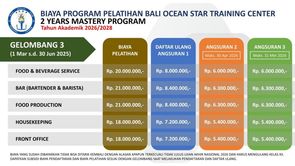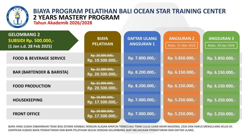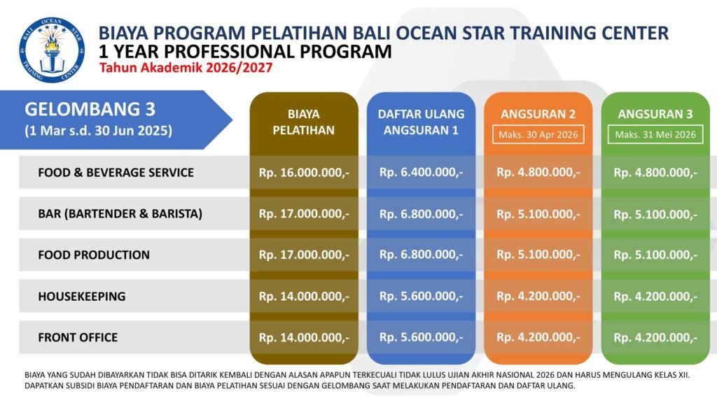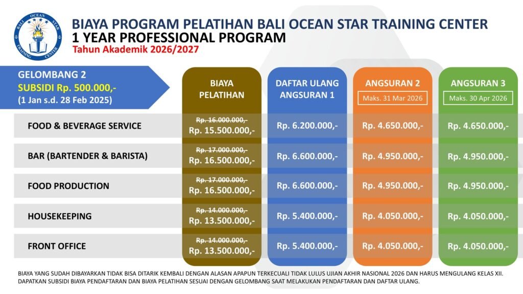 9 bulan masa pelatihan, 6 bulan on the job training, dilanjutkan internship/penyaluran kerja ke luar negeri – Merupakan program untuk peserta pemula yang belum memiliki pengalaman di bidang hospitality maupun mereka yang telah memiliki pengetahuan dasar atau pengalaman kerja di bidang pariwisata.