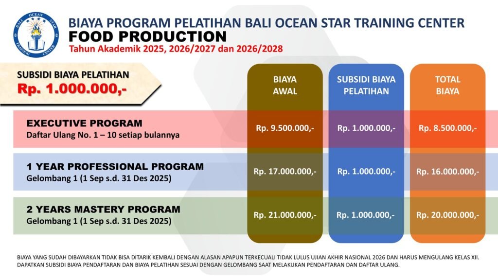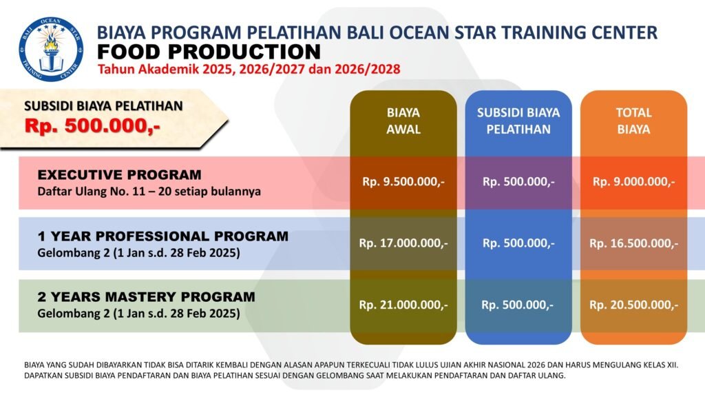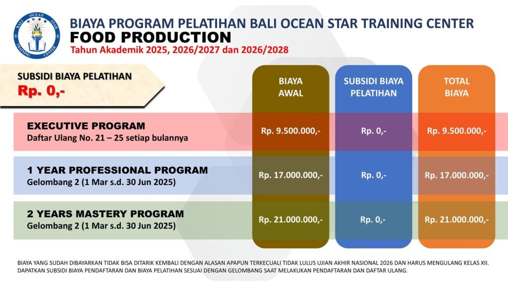 Program pelatihan Food Production dari BALI OCEAN STAR TRAINING CENTER (BOSTC) dirancang untuk mencetak tenaga kerja terampil dan siap bersaing di industri kuliner global. Dalam pelatihan ini, peserta akan: