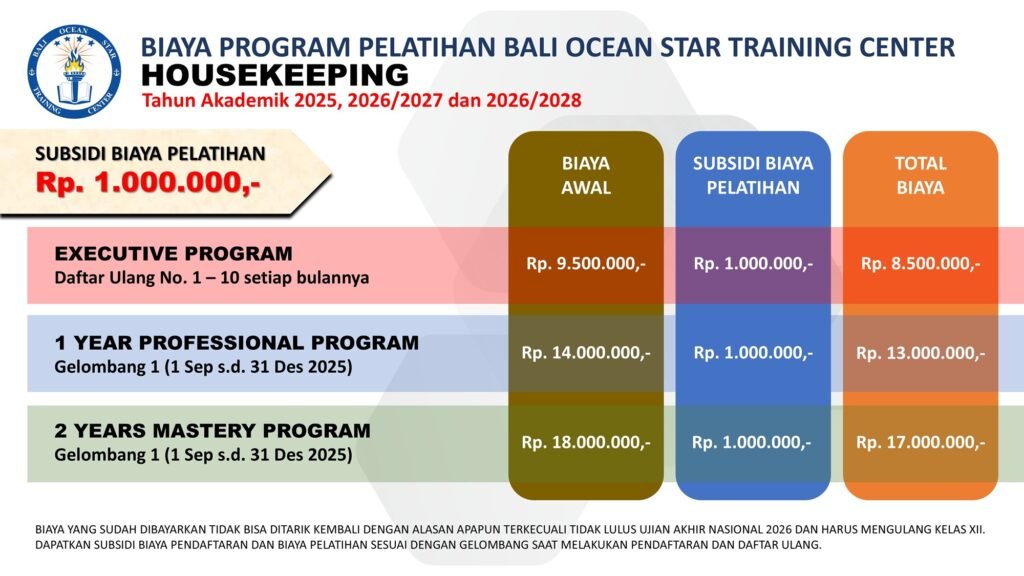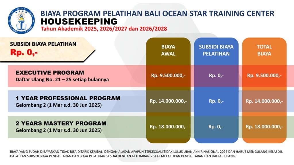 Program pelatihan Housekeeping BALI OCEAN STAR TRAINING CENTER (BOSTC) dirancang untuk menghasilkan tenaga kerja terlatih yang mampu menciptakan suasana kerja yang bersih, nyaman, dan estetis—baik di hotel, resort, maupun kapal pesiar. Peserta akan dibekali keterampilan penting, termasuk: